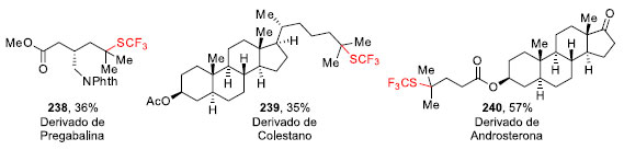 A formação dos compostos 237a-237d mostram que a trifuorometiltiolação ocorre preferencialmente na ligação C-H do carbono terciário mais rico em elétrons com bons rendimentos e alta seletividade, tolerando uma variedade de grupos funcionais, como benzoatos, ftalimidas, ésteres e amidas. Em geral, metilenos não reagiram bem para essa transformação, no entanto, o ciclo-hexano 237e e o ciclo-heptano 237f foram tri-fluorometiltiolados em 40% e 70% de rendimento, respectivamente.74 Esta metodologia também foi utilizada na funcionalização em estágio tardio de moléculas biologicamente ativas (Figura 4). Em todos os casos, o grupo SCF3, foi introduzido seletivamente na ligação C-H mais rica em elétrons, que normalmente é mais suscetível a alterações metabólicas de degradação.74