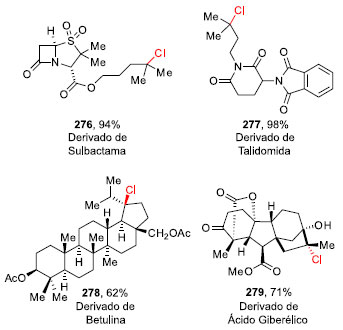 A cloração da betulina, um triterpeno que apresenta atividade anti-cancer, levou à formação do produto 278 em 62% de rendimento, sendo seletivo a apenas uma ligação C-H terciária, de um total de sete ligações de mesma característica. Por fim, o ácido giberélico, um diterpeno pentacíclico, com uso para crescimento de plantas e fungos, forneceu o produto 279 em 71%, sendo seletivo a uma ligação terciária frente a outras quatro.