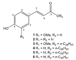 I. Centro de Ciências Naturais e Humanas, Universidade Federal do ABC, 09210-170 São Paulo - SP, Brasil Recebido em 22/06/2022 *e-mail: joao.lago@ufabc.edu.br In the present work, dried aerial parts of Baccharis ligustrina (Asteraceae) were subjected to microwave assisted extraction (MAE) using aqueous solution of 1-butyl-3-methylimidazolium bromide (BMImBr) and the obtained extract was successively partitioned using hexane and EtOAc. Using reduced amounts of extracts and efficient chromatographic steps, four acyl C6C3 derivatives (n-hexacosyl ferulate, n-hexacosyl, n-octacosyl, and n-triacontyl p-coumarates) were obtained from hexane phase whereas two C6C3 acids (ferulic and p-coumaric) were obtained from EtOAc phase. Isolated phenylpropanoids were evaluated against amastigote forms of parasite Trypanosoma cruzi. As result, it was observed that p-coumaric and ferulic acids were inactives whereas alkyl derivatives displayed EC50 values of 6.5 µmol L-1 (n-octacosyl p-coumarate), 9.3 µmol L-1 (n-triacontyl p-coumarate), 15.7 µmol L-1 (n-hexacosyl p-coumarate), and 32.2 µmol L-1 (n-hexacosyl ferulate). All tested compounds displayed reduced toxicity against NCTC cells (CC50 > 200 mmol L-1). INTRODUÇÃO O gênero Baccharis apresenta ampla distribuição em diferentes regiões do Brasil e conta com aproximadamente 500 espécies, das quais cerca de 20% são utilizadas na medicina popular para tratamento de inflamações, males do fígado, reumatismo e úlceras.1,2 Tais espécies são encontradas nas regiões sul e sudeste do país, principalmente em regiões de altitude (a cerca de 1800-2000 m do nível do mar), que são biomas com predominância de gramíneas e arbustos.3 Do ponto de vista químico, espécies de Bacharis são produtoras de diferentes metabólitos dos quais se destacam flavonoides, diterpenos de esqueletos caurano, labdano e clerodano e também de triterpenoides, principalmente de esqueletos oleanano e ursano.4-6 Além desses metabólitos, merece destaque a ocorrência de tricotecenos, que são derivados diterpênicos com importantes ações farmacológicas.7 Dentre as espécies estudas quimicamente encontra-se B. ligustrina, distribuída amplamente nos estados de Minas Gerais e São Paulo, e que se mostrou constituída essencialmente por dois triterpenos (ácidos oleanólico e ursólico) e dois flavonóides (naringenina e hispidulina).8 Como parte dos nossos estudos visando a prospecção de compostos bioativos em espécies de Baccharis,9-11 as partes aéreas de B. ligustrina foram submetidos à extração assistida por micro-ondas (MAE) usando solução aquosa de 1-butil-3-brometo de metilimidazólio (BMImBr) e o extrato assim obtido foi extraído sucessivamente com hexano e com AcOEt. Após diferentes processos de fracionamento cromatográfico em pequena escala foram obtidos, de ambas as fases de partição, seis derivados fenilpropanoídicos: ácido ferúlico (1), ácido p-cumárico (2), ferulato de n-hexacosila (3), p-cumarato de n-hexacosila (4), p-cumarato de n-octacosila (5) e p-cumarato de n-triacontila (6). Adicionalmente, os derivados C6C3 isolados (1-6) foram avaliados quanto a ação antiparasitária, em especial frente as formas amastigotas de Trypanosoma cruzi, protozoário causador da doença de Chagas. Essa doença, endêmica no Brasil, conta com um único fármaco disponível no país, o benznidazol, extremamente tóxico e com baixa eficácia, especialmente na fase crônica da doença.12 Frente a essa problemática, a busca de novos protótipos moleculares para o desenvolvimento de futuros fármacos para a doença de Chagas baseados em produtos naturais oriundos da biodiversidade brasileira consiste em uma abordagem importante, particularmente devido a ampla diversificação estrutural dos metabólitos especiais encontrados em espécies vegetais.13,14