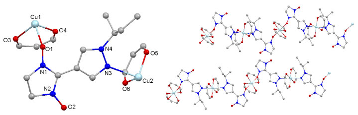 Figure 1 shows the asymmetric unit and a polymer chain of complex [{Cu(hfac)2}2L2]n. The molecular structure consists of the alternate copper-radical zig-zag chain running parallel to one another; that radical plays a crucial role in establishing this one-dimensional character, since it acts as a bidentate ligand, connecting metal ions. In the chain complexes, the CuO4 square environment in the Cu(hfac)2 coordination matrices is a distorted octahedron. The metal ion Cu1 is six coordinated by two oxygen atoms of the nitronyl nitroxide fragments, which is lying in the Cu1N2O4 coordination units alternate with the {>N1-O1-CuII-O1-N1<} heterospin clusters based on the "head-to-head" motif. The second oxygen atom of the nitronyl nitroxide fragment N2-O2 is not involved in coordination. The structural dynamics in the chains due to temperature variation are mainly related to the rearrangement of the Cu1O6 coordination units. The Cu2 ion is also coordinated by two nitrogen atoms of the pyrazole rings of the two bridgings bidentate L. Thus, the N3 atom occupied axial coordination sites. As a result, the apical Cu2-N3 bond length is 2.493 Å, while the equatorial Cu2-O(hfac) are much shorter than the apical bonds (around 1.958 Å).