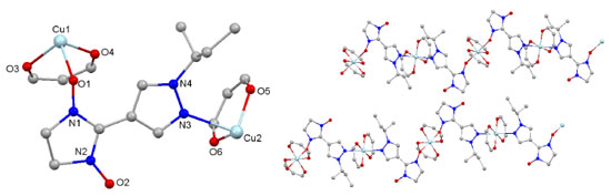 ![]() Figure 1. The structural of asymmetric unit (left) and the fragment of chain (right) of compound [{Cu(hfac)2}2L2]n. Fluorine, hydrogen and part carbon atoms are omitted for clarity