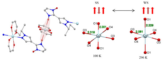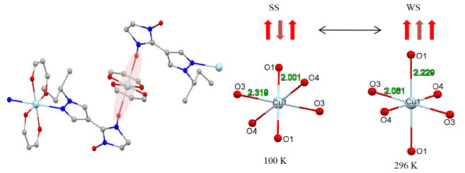 With the decrease in the temperature, the Cu1-O1 and Cu1-O3 bond lengths in the Cu1O6 units are drastically changed which was shown in Figure 2. At high temperatures (T~296 K), coordination octahedra Cu1O6 are elongated along the direction of the O1-Cu1-O1 axis, in which the Cu1-O1 distance is 2.229 Å. The Cu1-O1 bond shorted from 2.229 to 2.001 Å when the crystal is cooled from 296 K to 100 K, accompanied by a simultaneous lengthening of two Cu1-O3 bonds from 2.061 to 2.319 Å in one of the directions. With the decrease of temperature, the direction the elongated Jahn-Teller axis changed in the Cu1O6 units. At high temperatures, the axis is O1-Cu1-O1, while at low temperatures, the axis changed to O3-Cu1-O3. As a result, on lowering the temperature from 296 to 100 K, the nitroxides pass from axial to equatorial coordination positions of copper(II) ion. This rearrangement is accompanied by a switch of exchange interaction in spin triads nitroxide-copper(II)-nitroxide from weak ferromagnetic to a strong antiferromagnetic one.