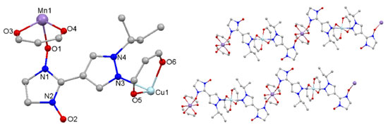 ![]() Figure 3. The structural of asymmetric unit (left) and the fragment of chain (right) of compound [MnCu(hfac)4L2]n. Fluorine and hydrogen atoms are omitted for clarity