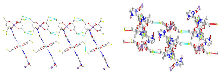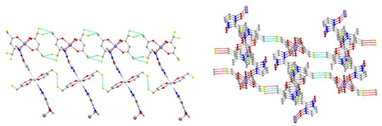 For compound [CuMn(hfac)4L2]n, the ligand L coordinated through the oxygen atom of the NO and N atom of pyrazole linkage to the metal leading to a zig-zag chain, as depicted in Figure 3. The asymmetric unit of complex consists of two half of metal atoms. One with a nearly octahedral coordination (Mn) which are occupied by four oxygen atoms (O3, O4) from two hfac units, two oxygen atoms (O1) from two nitroxide ligands. The other is elongated octahedron geometry (Cu) with hfac oxygen atoms (O5, O6) at the base and two pyrazole nitrogen atoms (N3) at the apex. The Mn1-O1 bond length is 2.146 Å, while the Mn1-O(hfac) is close to the bond (2.131 Å and 2.158 Å), and the Cu1-N3 bond length is 2.438 Å while the Cu1-O(hfac) are much shorter (1.981 Å and 1.995 Å). The angle of N1-O1-Mn1 is 128.89°. The nearest intrachain metal-metal distances are provided by Mn.Cu distance of 8.081 Å while the interchain Mn.Cu distance of 10.861 Å. In addition, there are two somewhat longer intermolecular F.F interaction (3.105 Å and 3.066 Å) which bridges the chains into layers. And one slightly longer intermolecular F.C interaction (3.110 Å) bridges the chains into network as shown in Figure 4.