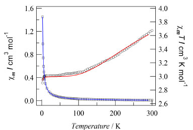 ![]() Figure 6. Temperature dependence of χm (square) and χmT (circular) for complex [CuMn(hfac)4L2]n