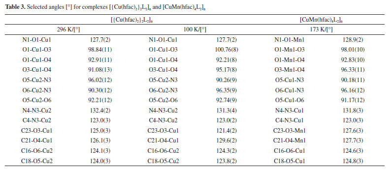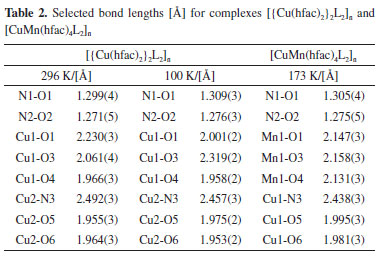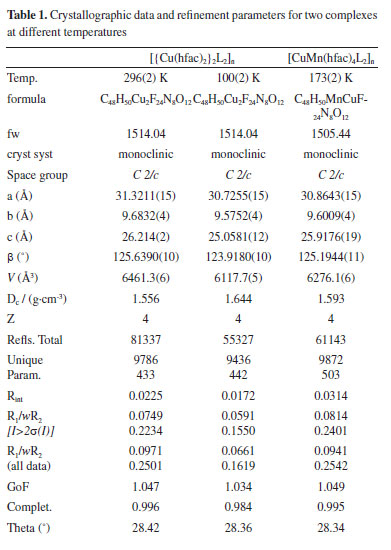 RESULTS AND DISCUSSION Structure descriptions Dark-blue crystals of the [{Cu(hfac)2}2L2]n and [CuMn(hfac)4L2]n heterospin complex are readily isolated with a high yield from the hexane solution of the equimolar amounts of M(hfac)2 and L. The synthesis of the complex is reproducible, and there are no impurities in the product. The molecular structures of [{Cu(hfac)2}2L2]n and [CuMn(hfac)4L2]n were successfully determined using X-ray crystallographic analysis at different temperature. The crystal and refinement data are summarized in Table 1. Complexes [{Cu(hfac)2}2L2]n and [CuMn(hfac)4L2]n crystallize in the monoclinic space group C2/c with Z = 4. Selected bond lengths and angles are listed in Tables 2 and 3, respectively.