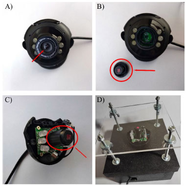 ![]() Figura 1. Etapas de construção do microscópio a partir da webcam (MW). A) webcam, a seta indica a posição inicial da lente da câmera; B) lente da câmera posicionada inversamente, após ser retirada da webcam, indicada pela seta; C) lente fixada com fita de forma invertida sobre o sensor da webcam; D) MW acoplado à base