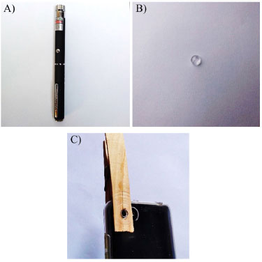 Microscópio a partir do Smartphone (MS) O microscópio construído a partir do smartphone (MS) foi produzido de acordo com o procedimento descrito por um vídeo do canal Manual do Mundo10 utilizando um smartphone Motorola G6 Play, com uma câmera principal de 13 megapixels e f/2.0, e de um apontador laser de marca genérica (Figura 2A).