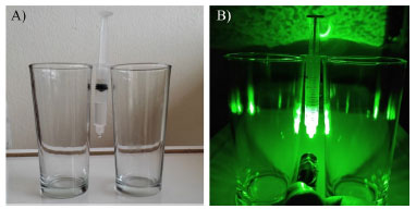 ![]() Figura 3. A) aparato denominado projetor de gotas, constituído por dois copos como suporte e seringa plástica descartável; B) projetor de gotas em utilização