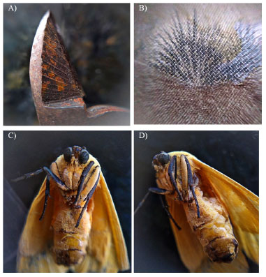 ![]() Figura 8. Capturas realizadas com o microscópio a partir do smartphone (MS) utilizando A) alicate oxidado (FS), B) nota de duzentos reais (FS), C)/D) mariposa (FS)
