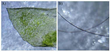 ![]() Figura 9. Capturas realizadas com o microscópio a partir do smartphone (MS) associado a uma lanterna utilizando como amostra A) folha de árvore e B) fio de cabelo