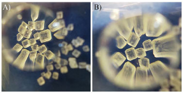 ![]() Figura 11. Capturas realizadas utilizando uma amostra de açúcar com (A) microscópio de gota de água e (B) microscópio de gota de glicerina