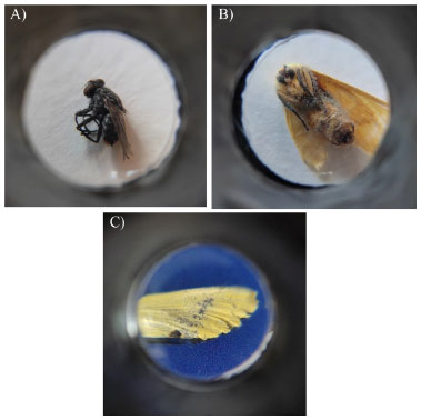 ![]() Figura 12. Capturas realizadas com o microscópio construído pela combinação de lentes para (A) mosquito, (B) mariposa e (C) asa de mariposa