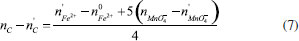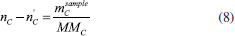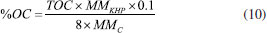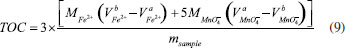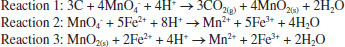 The analysis comprised of weighing the sample, with an accuracy of ± 0.1 mg, in a 100 mL digestion tube, to which 10.00 mL of 0.2 mol L-1 KMnO4 solution and 10 mL of H2SO4 were added. The digestion tube was inserted into the digester block and kept under heating for the oxidation of OC (Reaction 1). After this time, the tube was set to cool for 15 minutes. The contents were transferred to an Erlenmeyer flask with the subsequent addition of 2.5 mL of 85% w/w H3PO4 to avoid Fe3+ interference in the visualization of the color change at the endpoint of titration (Reaction 4). With the aid of a burette, the standardized solution of 0.2 mol L-1 ferrous ammonium sulfate was added until the solution was bleached (Reaction 2) and the brown solid was completely solubilized (Reaction 3). Excess Fe2+ was titrated with 0.02 mol L-1 KMnO4 solution until a slightly pink color persisted. The blank analysis did not use KHP or soil samples. The analyses were performed in triplicate. ![]() General equation to TOC determination by the proposed method Considering that ![]() If the sample solution contains millimoles of OC and ![]() For the Fe2+ ions added after permanganate oxidation, the mass balance is: ![]() where: ![]() Replacing Eq. 4 in Eq. 2, to eliminate the term ![]() The OC concentration, Fe2+ added, and titrant content in the blank analysis are different from the sample. Therefore, we have Eq. 6 for the blank, with the apostrophe (') being used to highlight the blank terms. ![]() Equating Eq. 5 to Eq. 6, we have: ![]() The term nC − nC´ corresponds to OC concentration in the sample, in mmol. In this case, we have Eq. 8: ![]() where: mCsample is the carbon mass in the sample, in mg; and MMC is the molar mass of carbon (12.0 g mol-1). Replacing Eq. 8 in Eq. 7 and knowing that the quantity of Fe2+ ions and titrant spent can be calculated from the respective concentrations and volumes of the solutions used, the TOC in the sample can be determined by Eq. 9: ![]() where: TOC is the total organic carbon content in the sample, in g kg-1; Computation of %OC The percentage of oxidized carbon (%OC) by the permanganate in the KHP samples was calculated according to Eq. 10: ![]() where: %OC is the percentage of oxidized carbon; TOC is the organic carbon content in the sample, in g kg-1; MMKHP is the molar mass of KHP, in g mol-1; MMC is the carbon molar mass, in g mol-1; 8 is the stoichiometric factor referring to the amount of carbon in the KHP; 0.1 is the conversion factor for the percentage. Reference method (Yeomans & Bremner)13 For the YB method, 500 mg (± 0.1 mg) of soil, 5.00 mL of 0.167 mol L-1 K2Cr2O7 solution, and 7.5 mL of concentrated H2SO4 were added to a 100 mL digestion tube. The tube was placed on the digester block and kept at 170 °C for 30 minutes for the OC oxidation (Reaction 5). After cooling and completing the volume with distilled water to make it 50 mL, 10 mL of 85% w/w H3PO4 and 5-8 drops of ferroin indicator solution were added to the tube. The mixture was titrated with 0.2 mol L-1 ferrous ammonium sulfate solution (Reaction 6). The blank analysis did not comprise any soil sample addition. Additionally, blank analysis was performed without heating in a digester block to account for the amount of dichromate lost due to heating. Analyzes were performed in quintuplicate. ![]()