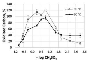 ![]() Figure 1. Percentage of oxidized carbon (% CO) in KHP as a function of the negative logarithm of the sulfuric acid molar concentration (logCH2SO4) at temperatures of 60 °C and 95 °C (N = 3)