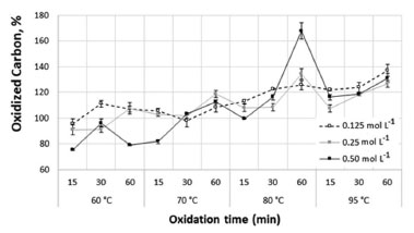 ![]() Figure 2. Percentage of carbon oxidized by KMnO4 in KHP, under different concentrations of H2SO4 (0.125, 0.25 and 0.5 mol L-1), temperatures (60, 70, 80 and 95 °C) and reaction times (15, 30 and 60 min) (N = 3)