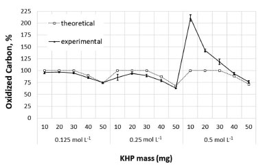 ![]() Figure 3. Theoretical and experimental percentages of oxidized carbon in the reaction of KHP with KMnO4 using different H2SO4 concentrations (0.125, 0.25 and 0.5 mol L-1) and KHP masses (10, 20, 30, 40 and 50 mg) (N = 3)