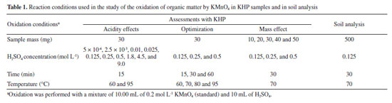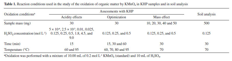 EXPERIMENTAL Reagents and materials The following reagents were used in its analytical grade: C8H5O4K (KHP, 99.95%, Vetec, Duque de Caxias, Brazil), Na2C2O4 (99%, Vetec, Duque de Caxias, Brazil), K2Cr2O7 (99.9%, Merck, Duque de Caxias, Brazil), KMnO4 (99%, Proquimios, Rio de Janeiro, Brazil), o-phenanthroline (Proquimios, Rio de Janeiro, Brazil), H3PO4 (85%, Sigma-Aldrich, Duque de Caxias, Brazil), H2SO4 (95 98%, Proquimios, Rio de Janeiro, Brazil), (NH4)2Fe(SO4)2·6H2O (98.5 101%, Isofar, Duque de Caxias, Brazil) e FeSO4.7H2O (99%, Sigma-Aldrich, Duque de Caxias, Brazil). The C8H5O4K was ground in a mortar and dried at 105 °C. All other reagents were used as they were commercially obtained. Solutions were prepared in distilled water. Soil samples were donated by the Soil Laboratory of the Agronomy Institute of the Universidade Federal Rural do Rio de Janeiro and are classified in the Brazilian Soil Classification System57 as: latossolo (profile 88, horizon A, coordinates 7508038/602084 UTM, WGS84), chernossolo (profile 202, horizon A, coordinates 7506551/602447 UTM, WGS84), gleissolo (profile 59, horizon A, coordinates 7509474/604061 UTM, WGS84) and cambissolo (profile 74, horizon A, coordinates 7504384/603060 UTM, WGS84) equivalent to oxisols, molisols, entisols (Aqu-alf-and-ent-ept-) and inceptisols, respectively, in the Soil Taxonomy classification.58 The OC oxidation procedures were carried out in a Quimis® dry block digester (model Q327-A242, Diadema, Brazil), preheated to the working temperature. Class A volumetric flasks and pipettes were used. Preparation and standardization of standard solutions The 0.1666 mol L-1 K2Cr2O7 e 0.07015 mol L-1 Na2C2O4 standard solutions were prepared by dissolving 49 g (± 0.0001 g) of K2Cr2O7 and 9.4 g (± 0.0001 g) of Na2C2O4, respectively, in water with posterior dilution (1000.0 mL) in a volumetric flask. The 0.2 mol L-1 KMnO4 solution was prepared by dissolving 63.2 g de KMnO4 in 2000 mL water. This solution was heated at 100 °C for 30 minutes, filtered through glass wool, stored in an amber bottle, protected from light, and kept at room temperature. This solution was standardized by titrating 50.00 mL of a 0.07015 mol L-1 Na2C2O4 solution with 40 mL of 3.0 mol L-1 H2SO4 solution. The 0.02 mol L-1 KMnO4 solution was prepared by diluting the 0.2 mol L-1 KMnO4 solution and, later, standardizing it with 25.00 mL of 0.07015 mol L-1 Na2C2O4 standard solution mixed with 20 mL of 3.0 mol L-1 H2SO4 solution. The 0.2 mol L-1 ferrous ammonium sulfate solution was produced by dissolving 156.8 g of (NH4)2Fe(SO4)2·6H2O in 100 mL of concentrated H2SO4 and then diluting it in water until completing 2000.0 mL. Then, 10.00 mL of this solution was mixed with 20 mL of 3.0 mol L-1 H2SO4 solution and subsequently titrated against 0.02 mol L-1 KMnO4 solution. Standardizations were performed in duplicate. Proposed method The proposed method basically consisted of oxidizing the OC with 0.2 mol L-1 KMnO4 (Reaction 1) and posteriorly reacting the excess of KMnO4 (Reaction 2) and the MnO2 produced (Reaction 3) with 0.2 mol L-1 Fe2+. Finally, the excess Fe2+ was titrated with 0.02 mol L-1 KMnO4 (Reaction 2). ![]() For the development and evaluation of this method, the percentage of oxidized carbon (%OC) was determined in a high purity KHP standard, under different conditions of acidity, temperature, and reaction time, as listed in Table 1. The influence of the KHP mass was also investigated (Table 1). The conditions that provided the best %OC in the KHP samples, closer to 100%, were used to analyze soil samples (Table 1).