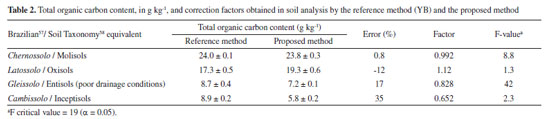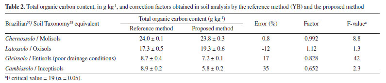In fact, the nature of the matrix and environmental characteristics affect the reliability of different methods for measuring carbon content.27 Different soils present diverse sorption properties (of inorganic and organic particles) as well as various OM protection mechanisms within the aggregates that contribute to the storage of OM and its lability.60 The organic matter quality can be one of the contributors to the divergences observed in the methods.61 Hence, consistent measurements among different methods, matrices and applications can enable further trend comparisons.27 Moreover, the differences among methods can be corrected by the use of correction factors (Table 2), calculated according to Eq. 11: ![]() where: f is the correction factor; TOCRef and TOC are the organic carbon contents obtained by the reference and proposed methods (in g kg-1), respectively. Correction factors have been widely used in the routine analysis of soil samples,26,28,62 as SOM can be highly complex, ranging from compounds such as simple sugars and amino acids to acids humic and fulvic. Thus, in some instances, the oxidation of OC may not be complete justifying the use of correction factors even in official methods that have been used for several decades, such as YB and WB.26,28,62 Therefore, the differences observed in the results in Table 2 do not constitute a problem capable of disqualifying the proposed method since its potential was proven in the KHP analysis. In this case, the observed deviations for a specific type of soil can be corrected, as usual, using correction factors. Concerning the precision of the methods (Table 2), it was observed that the proposed method was statistically similar to the reference method (YB) under the one-tailed F-test (α =0.05), except for the gleissolo, which was superior. These results display the similarity between the two methods, indicating that both can be applied interchangeably in the TOC determination. Feasibility of the proposed method to be applied in carbon dynamics studies Due to the importance of SOC to the sustainability of the ecosystems, its determination has become essential as a soil health indicator because it reflects soil organic matter dynamics.4,8,14 In order to quantify and evaluate soil health and quality, adequate indicators are required.8,53 Indicators suitable for soil health evaluation must be rapid and straightforward, cost-effective, sensitive to management, and present low analytical variability.8,53 For the United States Department of Agriculture - Natural Resources Conservation Services, both dry combustion (EA) and wet oxidation are considered candidate indicator methods for OC. However, the EA is regarded as a more suitable option since it meets all criteria except for the minimal infrastructure and investment, which is partially met due to the high cost of acquiring a carbon analyzer. At the same time, the major drawbacks of the wet oxidation (YB) method are the hazardous waste and its disposal.8 The analysis of 100 soil samples through the method proposed in this study could reduce K2Cr2O7 consumption by 49 g (Table 3). The Cr6+ has high carcinogenic, mutagenic, reproductive, dermal, and inhalation toxicity potential.63 Therefore, although Cr6+ is reduced to Cr3+ (less toxic) at the end of the analysis, handling K2Cr2O7 exposes the analyst to unnecessary risks that could be avoided by using a safer oxidant (e.g., KMnO4).
