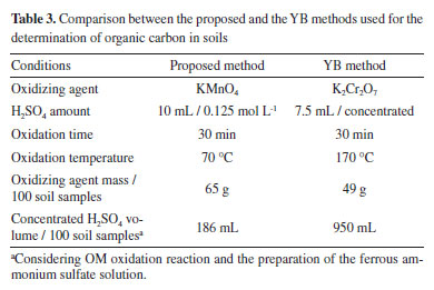 The oxidation of OM by KMnO4 using 0.5 mol L-1 H2SO4 and 10, 20, and 30 mg of KHP was overestimated as the %OC varied from 120% to just over 210% (Figure 3), which may be related to the parallel KMnO4 reaction with water (Reaction 9). Across the three acidity conditions tested, the %OC values were lower for the masses of 40 and 50 mg of KHP. This behavior is due to the amount of KMnO4 used, which was insufficient to react completely with the OC of 40 and 50 mg of KHP, based on the stoichiometry of Reaction 1. The agreement between the theoretical and experimental %OC values under the conditions in that there was no substantial influence of parallel reactions (10 - 50 mg of KHP, in 0.125 and 0.25 mol L-1 H2SO4 and 40 - 50 mg of KHP, in 0.5 mol L-1 H2SO4, Figure 3) corroborate the proposal of this work, in which the primary reaction between OC and KMnO4 involves the formation of MnO2 (Reaction 1) confirming its feasibility as an oxidant to TOC determination. Soil TOC determination The oxidation of SOM with KMnO4 was carried out at 70 °C for 30 min, using 0.125 mol L-1 H2SO4 (Table 1), as these are the best conditions observed for the oxidation of KHP (Figure 2 and Figure 3). Although differences were observed between the proposed method and YB, for three types of soil (Table 2), these differences do not invalidate the method. Pereira et al.28 also found a significant relative error ranging from 67% to 129% between TOC determined with EA and YB in cambissolo samples.