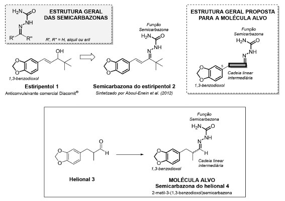 ![]() Figura 1. Estrutura geral das semicarbazonas e estruturas químicas do estiripentol 1, da semicarbazona do estiripentol 2, do helional 3 e da semicarbazona do helional 4, a molécula alvo cuja síntese e caracterização são propostas neste trabalho