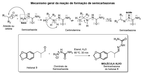![]() Figura 2. Mecanismo geral da reação de formação de semicarbazonas e rota sintética para obtenção da semicarbazona do helional 4