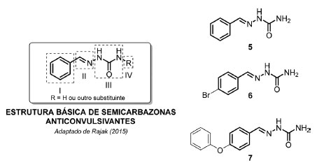 ![]() Figura 3. Características estruturais de semicarbazonas com ação anticonvulsivante e alguns exemplos de aril semicarbazonas bioativas, onde: I) sítio de interação hidrofóbica do tipo aril; II) sítio com grupo doador de elétrons; III) sítio de ligação de hidrogênio; e IV) sítio hidrofóbico ou hidrofílico para controle/adequação de propriedades farmacocinéticas (adaptado de Beraldo, 2004 e Rajak, 2015)16,17