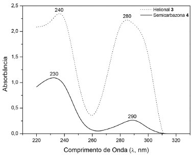 ![]() Figura 4. Espectro de absorção molecular na região do UV-Vis do helional 3 e do seu derivado semicarbazona 4
