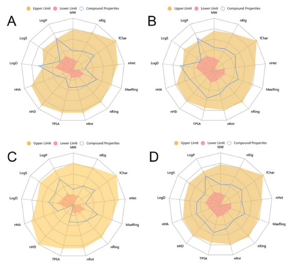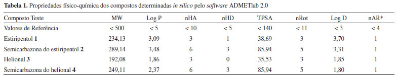 ![]() Figura 5. Representação gráfica da análise das propriedades físico-químicas para os compostos teste, onde: A (estiripentol 1), B (semicarbazona do estiripentol 2), C (helional 3) e D (semicarbazona do helional 4)