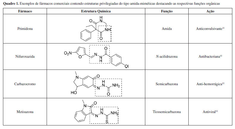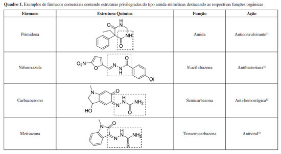 Na síntese da semicarbazona, o par de elétrons do nitrogênio nucleofílico da amina (-NH2) da semicarbazida ataca o carbono da carbonila (C=O) do aldeído ou cetona, gerando um intermediário instável de carbinolamina, o qual sofre eliminação de água para produzir a ligação azometina (C=N) e a imina correspondente (semicarbazona), Figura 2. Em geral, a reatividade de aldeídos é maior que de cetonas, por serem estericamente menos impedidos. Essa reação também é afetada pelo pH, sendo mais bem conduzida em meio contendo quantidades catalíticas de ácidos para facilitar a etapa determinante da velocidade da reação, que é a desidratação da carbinolamina. Contudo, deve-se evitar pH muito baixo para minimizar a protonação da amina e suprimir o ataque nucleofílico no início da reação.8 Em razão da ligação dupla presente no grupo funcional semicarbazona, denominada de azometina (C=N), esses compostos produzem isômeros geométricos E e Z, os quais são geralmente obtidos como uma mistura de ambos, sendo normalmente majoritária a configuração E. Outro fenômeno também decorrente dessa ligação dupla é o tautomerismo ceto-enólico (R1R2C=N-NH-C(=O)-NH2 R1R2C=N-N=C(OH)-NH2), o qual é observado em solução. Porém, quando isoladas em fase sólida, as semicarbazonas mantém-se majoritariamente na forma ceto.3 Outra propriedade química relevante das semicarbazonas é a facilidade de complexação com cátions metálicos. Na forma ceto, a função semicarbazona coordena com o cátion metálico usando preferencialmente o nitrogênio da azometina e o oxigênio da carbonila. Já na forma enólica, e em solução básica, observa-se a desprotonação do enol e formação de um sítio aniônico que também coordena, junto com o nitrogênio imínico, cátions metálicos. Contudo, em ambas as formas tautoméricas, as semicarbazonas atuam normalmente como ligantes bidentados.3 Propriedades farmacológicas das semicarbazonas A semicarbazona representa um grupo funcional orgânico que, sob a ótica da QM, é considerada uma estrutura privilegiada amida-mimética, assim como as N-acilidrazonas e as tiossemicarbazonas.10 Do ponto de vista estrutural, as semicarbazonas apresentam um arcabouço molecular simples, normalmente presente em vários fármacos ou em compostos bioativos protótipos de fármacos, e capaz de fornecer sítios de interação com biorreceptores, Quadro 1. Cabe frisar que modificações moleculares suplementares de estruturas privilegiadas, envolvendo a inserção de outras subunidades estruturais, tem se tornado um conceito e uma estratégia útil ao desenvolvimento da QM moderna e ao desenvolvimento de novos compostos ativos.6