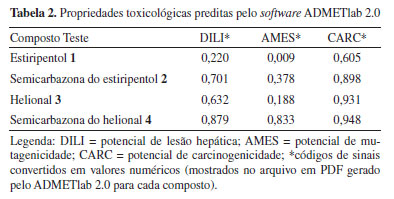 Em relação à toxicidade predita pelo ADMETlab 2.0 (Tabela 2) para os três compostos analisados, a semicarbazona 4 demonstrou o maior risco em produzir efeitos tóxicos, seguido de seu precursor (helional 3), da semicarbazona do estiripentol 2 e, por fim, do fármaco estiripentol 1, o qual exibe o menor potencial toxicológico considerando os parâmetros comparados de DILI - Potencial de lesão hepática; AMES - Potencial de mutagenicidade; e CARC - Potencial de carcinogenicidade. Comparando o estiripentol 1 e a sua respectiva semicarbazona 2, percebe-se que o aumento de potencial tóxico predito foi provavelmente associado à substituição da hidroxila presente no fármaco 1 pela função semicarbazona, na estrutura de seu derivado (2). E, comparando-se esses dois últimos compostos teste com a semicarbazona do helional 4, apesar da menor similaridade estrutural entre essas substâncias, a ausência da insaturação e do grupo terc-butil associada à presença da função semicarbazona, podem ter proporcionado uma maior toxicidade para a molécula alvo 4. Assim, frente aos dados apresentados, pode-se inferir que a presença da função semicarbazona, apesar de ela ser considerada uma estrutura privilegiada na Química Medicinal, nos estudos in silico em questão elevou a toxicidade dos derivados que a possuem.