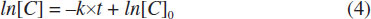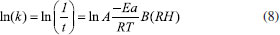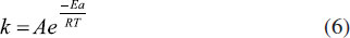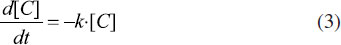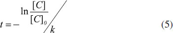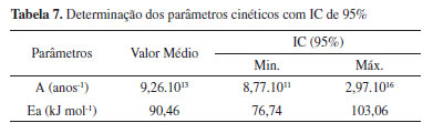 Cinética de degradação térmica Durante o armazenamento, algumas transformações desejáveis e indesejáveis podem ocorrer nos materiais. A compreensão dessas reações é de fundamental importância para a determinação da vida útil do material bem como no estabelecimento das suas condições ideais de armazenamento.12 Essas transformações podem ser expressas matematicamente e os padrões de ordem zero ou de primeira ordem descrevem a maioria das alterações observadas.12 A modelagem cinética da degradação térmica de uma reação de primeira ordem pode ser representada, genericamente, pelas Equações 2 e 3:13 ![]() ![]() em que v é a velocidade da reação, k é a constante de velocidade e C é a concentração do reagente. Representando a Equação 3 acima na sua forma logarítmica temos a Equação 4. ![]() Por meio da Equação 4 observa-se que o coeficiente linear obtido obedece à expressão logarítmica da concentração no tempo zero (ln [C]0) e o coeficiente angular à constante de velocidade da reação (k). Organizando a Equação 4, o cálculo do tempo de degradação associado a um material, para uma reação de primeira ordem, é obtido conforme Equação 5. ![]() Os métodos de cálculo de parâmetros cinéticos são utilizados para a determinação da velocidade da reação (k), energia de ativação (Ea) e temperatura de decomposição do material.14 A Equação de Arrhenius estabelece a correlação dos parâmetros cinéticos de decomposição do material com a temperatura, como apresentado na Equação 6.15 ![]() A relação da velocidade da reação proposta por Arrhenius pode ser combinada com a umidade relativa, dando origem à Equação 7.15 ![]() Transformando-se a equação acima para o formato linear e relacionando a velocidade da reação como sendo proporcional ao recíproco de tempo, tem-se a Equação 8.15 ![]() sendo A: fator pré-exponencial; Ea: energia de ativação; R: constante universal dos gases (8,314 J mol-1 K-1); T: é a temperatura absoluta (K); B: constante de sensibilidade a umidade relativa; e RH: umidade relativa (%).
