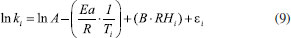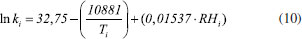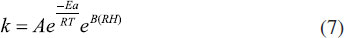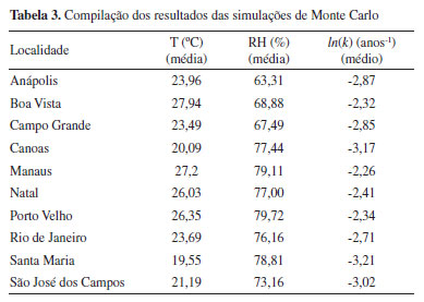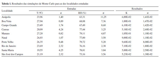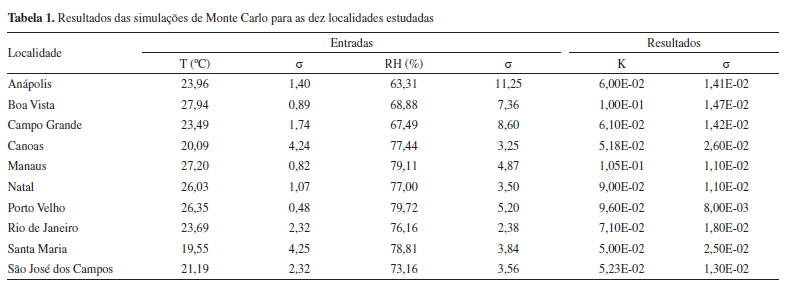 RESULTADOS E DISCUSSÃO Execução das simulações A primeira etapa das simulações foi realizada com o objetivo de se obter as diferentes constantes de velocidade da reação (k) em função das condições climáticas das dez localidades estudadas (T e RH), e seus respectivos desvios padrões (Σ), conforme resultados apresentados na Tabela 1.
