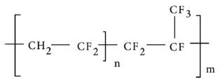 Os principais produtos de decomposição deste polímero são tetrafluoroetileno (C2F4) e CF2, que também sofrem decomposição durante a reação, resultando na formação de (COF2), do ácido fluorídrico (HF) e dióxido e monóxido de carbono (CO2 e CO, respectivamente). Para uma aplicação em flares MTV, o principal a considerar é o tamanho de partícula do Teflon® usado e a importante influência que este terá na taxa de queima linear.8,9 O Viton® é um fluoroelastômero quimicamente e termicamente inerte com excelentes propriedades de vedação e é usado como um aglutinante.6 Seu uso em flares MTV é destinado à proteção das partículas de magnésio contra oxidação causada pela contaminação por umidade durante o período de armazenamento do dispositivo.8 A estrutura química do Viton® é mostrada na Figura 2.