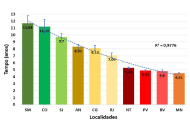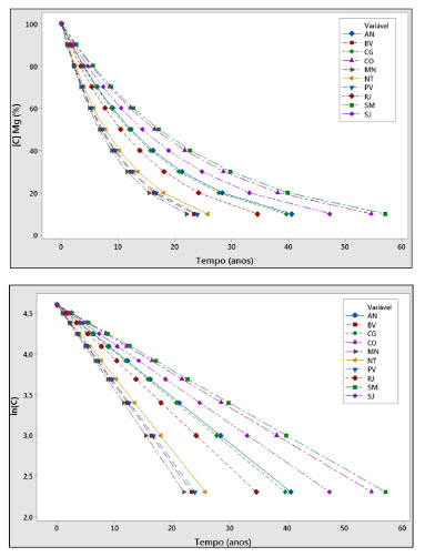 A segunda etapa das simulações consistiu na determinação dos tempos de degradação do Mg em Mg(OH)2, conforme estabelecido pela Equação 5. A Figura 5 apresenta as curvas obtidas de degradação do Mg em cada uma das localidades estudadas. Por meio dela pode-se observar uma diferença nas suas curvas de degradação, bem como as diferentes inclinações das retas obtidas, caracterizando diferentes valores das constantes de velocidade da reação (k) obtidos em cada localidade.