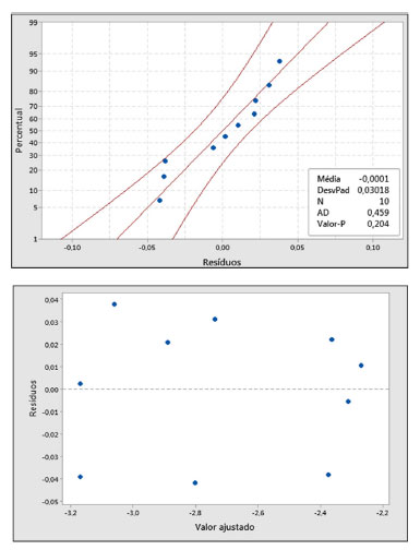 Para a aplicação e validação dos resultados do teste ANOVA alguns pressupostos obrigatoriamente foram checados, sendo eles:21 a) normalidade - resíduos normalmente distribuídos e A análise dos resíduos da ANOVA apresenta o valor-p para o teste de normalidade de 0,204 (Teste de Anderson Darling - AD = 0,459), indicando, assim, que os resíduos seguiram uma distribuição normal. A Figura 7 apresenta os gráficos dos resíduos em função da resposta do modelo, indicando a sua aleatoriedade e independência.