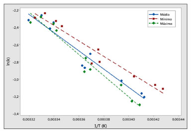 A Figura 8 apresenta as curvas de velocidade da reação em função do recíproco da temperatura, no qual, por meio da inclinação das retas, é possível obter os valores de energia de ativação conforme equação de Arrhenius.