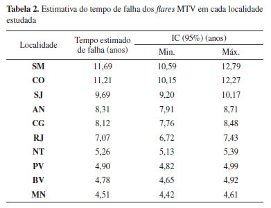 A terceira e última etapa consistiu na determinação do tempo estimado de falha dos flares MTV em cada localidade, os quais podem ser verificados na Tabela 2 e na Figura 6, considerando um intervalo de confiança (IC) de 95%.