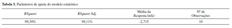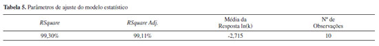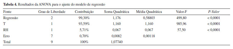 Os resultados apresentados na Tabela 4 mostram que o modelo de regressão apresenta significância estatística para a descrição do fenômeno estudado, observando-se uma contribuição maior dos efeitos da temperatura para o modelo estatístico. Observando-se os valores de RSquare e do RSquare Adj (ajustado) na Tabela 5 conclui-se que o modelo estatístico proposto explica de forma adequada os dados obtidos neste trabalho.