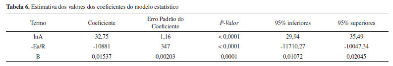 Observando na tabela acima a coluna com os valores do P-Valor, percebe-se valores muito menores que o nível de significância adotado (0,05). Isso indica que os coeficientes obtidos são relevantes na estimativa de modelo estatístico proposto, ou seja, contribuem para aumentar ou diminuir a resposta predita. Nesse contexto, a partir dos dados observados na Tabela 6, pode-se inferir que o modelo obtido pode ser considerado significativo para essa finalidade, considerando-se um intervalo de confiança de 95%. Uma vez validados os resultados obtidos, a Equação 9 pode ser reescrita, dando origem à Equação 10. ![]() Por meio da Equação 10, foram estimados a energia de ativação e o fator pré-exponencial para a conversão do magnésio em hidróxido de magnésio, conforme mostrado na Tabela 7. Tais valores são condizentes com os encontrados na literatura.22-24