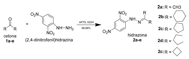 PARTE EXPERIMENTAL Materiais e métodos Procedimento geral para síntese das hidrazonas Para a síntese das hidrazonas (2a-e, Esquema 1), foram utilizadas as seguintes cetonas: 2-propanona (1a), ciclo-hexanona (1b), ciclopentanona (1c), 3-pentanona (1d) e ciclobutanona (1e). Em um balão (50 mL), foram adicionados 5,25 mmol de ácido p-toluenossulfônico (0,904 g), dissolvidos em 25 mL de etanol. Em seguida, adicionou-se 5 mmol de 2,4-dinitrofenil-hidrazina (0,991 g) e 5 mmol de cetona 1a-e.20 Após adição de todos os reagentes, a reação foi colocada sob refluxo em banho de glicerina e permaneceu durante 2 horas. Os sólidos precipitados foram filtrados sob vácuo e, em seguida, recristalizados usando 100 mL etanol. Após a formação dos cristais, os mesmos foram filtrados por filtração simples e, após secos, pesados para o cálculo do rendimento (66-88%). ![]() Esquema 1. Síntese de hidrazonas