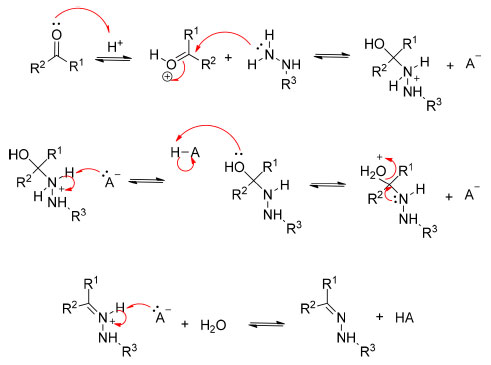 ![]() Esquema 2. Mecanismo geral de formação de hidrazonas via catálise ácida (fonte: adaptado de Clayden, Greeves e Warren, 2012)22