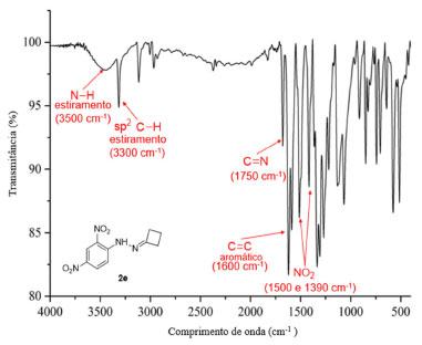 De acordo com a metodologia supracitada, foi sintetizada uma sequência de hidrazonas 2a-e usando 2,4-dinitrofenil-hidrazina como reagente de partida, substituída por 5 cetonas diferentes. Após sintetizados, os compostos foram caracterizados por Espectroscopia de IV e CG-EM. Como exemplo, a Figura 2 mostra o espectro infravermelho do composto 2e. Pode-se observar que o grupo hidrazona apresenta duas ligações características: N-H e C=N, detectados no espectro a 3500 e 1750 cm-1, respectivamente. De acordo com o reagente de partida utilizado, as moléculas apresentam dois grupos nitro, demonstrando 2 bandas fortes a 1500 e 1390 cm 1. Além disso, todos os compostos em estudo no presente trabalho apresentam um anel aromático em suas estruturas, por esta razão as faixas características das ligações C=C são observadas em torno de 1600 cm-1 e o estiramento das ligações C-H dos carbonos sp2 em torno de 3300 cm-1.