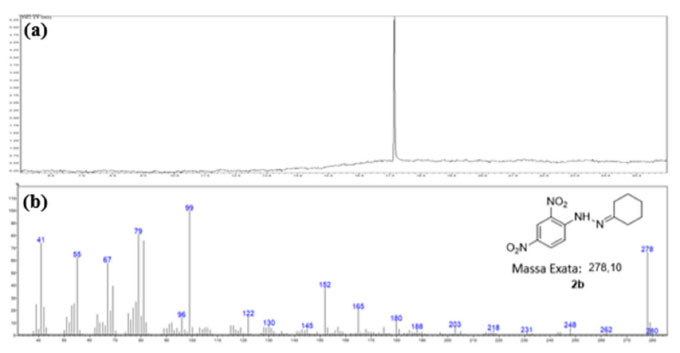 As Figuras 3a e 3b ilustram o cromatograma e o espectro de massa do composto 2b, respectivamente. No cromatograma (Figura 3a) é possível observar a presença de apenas um pico, referindo-se ao composto em análise. O respectivo espectro de massa (Figura 3b) para o pico mostra o íon molecular (m/z) correspondente ao peso molecular da substância, com uma massa M+ de 278. Além do mais, o perfil de fragmentação está de acordo com a literatura, confirmando a estrutura. Todos espectros de infravermelho, cromatogramas e espectros de massa dos demais compostos estão disponíveis no Material Suplementar.
