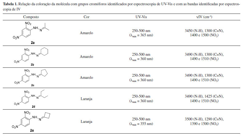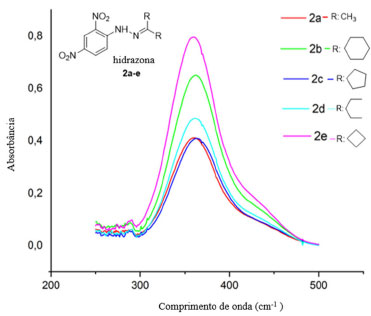 Todos os compostos apresentam em sua estrutura uma conjugação com o sistema π-anel. Analisando a Figura 4, os compostos sintetizados mostraram uma faixa de máximos de absorção em 355-365 nm (λmax), que é atribuível à transição eletrônica n→π* do sistema dos grupos cromóforos azo (H3C-N=N-R) quando apresentados na forma do seu tautômero desprotonado, responsável por sua cor amarelo-alaranjado.24 A relação entre a cor da molécula (pó) de cada composto, os grupos cromóforos identificados pela faixa de comprimento de onda onde ocorreu a absorção, e as respectivas faixas de IV são mostradas na Tabela 1.