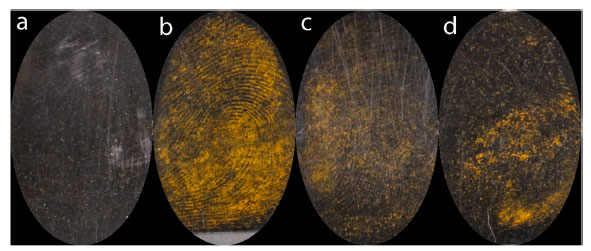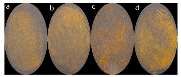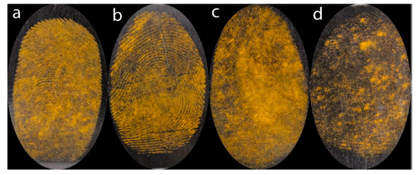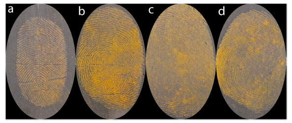 ![]() Figura 6. Impressões digitais naturais, depositadas em superfície de plástico, reveladas pelo composto 2d