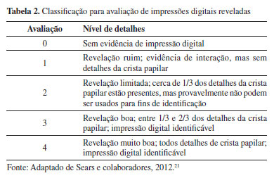 A partir das IDLs naturais e sebáceas de 4 doadores depositadas, foram aplicadas as hidrazonas sintetizadas (2a-e) nas diferentes superfícies (vidro e plástico) e foi avaliada a eficácia de revelação de impressões digitais naturais e sebáceas através do nível de detalhes das cristas papilares, que são os relevos presentes nas pontas dos dedos responsáveis pelos desenhos das impressões digitais. Nesse sentido, para avaliar a qualidade das impressões digitais reveladas, foi empregada a escala desenvolvida por Sears e colaboradores,21 descrita na Tabela 2.