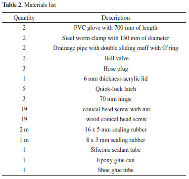 MATERIALS AND METHODS Glove box construction All materials presented in Table 2 were acquired locally. The wooden box was produced by a local joiner, in accordance with the dimensions given in Figure 1, using white MDF (medium density fiberboard) of 15 mm of thickness.