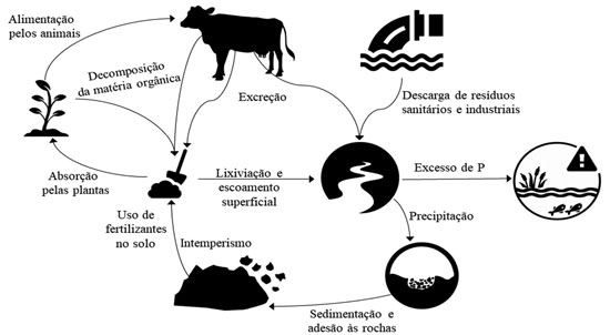Processos de intemperismo são responsáveis pelo lançamento de íons de fosfato e outros minerais, a partir de rochas fosfáticas, para o solo e para a água. O P inorgânico recebido pelos solos pode ser absorvido pelas raízes das plantas, sendo assimilado posteriormente pelos animais durante a alimentação. Nesse caso, o nutriente tende a voltar para os solos por meio dos excrementos desses animais e pela decomposição da biota, permitindo a reciclagem do elemento diversas vezes antes da sua remoção para outro ambiente.5 Entretanto, por fatores como a mineralização, erosão e descarga de resíduos, o fósforo acaba atingindo as águas, em um ciclo considerado praticamente unidirecional, devido sua cinética extremamente lenta. No oceano, o elemento se encontra em duas formas: dissolvido, ou agregado à material particulado. Quando particulado, o P se encontra majoritariamente como sedimentos no fundo do oceano e é retornado à terra a partir de correntes. Já a porção que se encontra dissolvida é absorvida por fitoplânctons e plantas aquáticas, o que faz com que a concentração de fósforo dissolvido, ou inorgânico, seja quase nula. Quando esses organismos morrem, os nutrientes (que se encontram em forma orgânica) são acumulados no fundo e eventualmente transportados até a costa terrestre, resultando em uma nova formação de rochas fosfáticas, pela diagênese. Esse processo é muito demorado, levando de 108 a 109 anos para acontecer.1,5 Dentro do ecossistema aquático, um processo importante é o mecanismo de regulagem da concentração de fosfato na coluna de água, que varia com a concentração de oxigênio dissolvido, que por sua vez tem papel controlador na relação do par redox Fe(II)/Fe(III) com a biodisponibilidade de fósforo. Tal acoplamento dos ciclos biogeoquímicos do oxigênio, ferro e fósforo são determinantes no controle da produtividade primária de ecossistemas aquáticos, ao gerir a associação de fosfato com óxi-hidróxidos de Fe(III), responsáveis por formar um produto com baixa solubilidade, depositado nas camadas mais profundas (hipolímnio).6 Na região do hipolímnio, com baixa concentração de oxigênio, é possível caracterizar o ferro como receptor de elétrons. Como consequência, óxi-hidróxidos de Fe(II) são gerados. Devido a maior solubilidade das espécies química de fósforo e Fe(II) em comparação às formadas com Fe(III), tem lugar a liberação de PO43-, que migra para a zona eufótica. O mecanismo existente se dá como uma bomba de fósforo que controla a fertilização da zona de água superficial, onde ocorre a fotossíntese, e regula a quantidade de fosfato entre a coluna de água e os sedimentos. A reciclagem do nutriente ocorre naturalmente repetidas vezes entre as áreas citadas, uma vez que o O2 gerado na fotossíntese irá oxidar o Fe(II) até Fe(III) e ele irá remover o P da zona eufótica, controlando naturalmente a produtividade primária, ou seja, a conversão do fósforo inorgânico em orgânico, em um processo que dá origem à vida e ao fluxo de massa e energia ao longo da cadeia trófica. Nesse ponto, é importante entender que a retenção de P pelos óxi-hidróxidos de Fe(III) na região sedimentar origina um reservatório de fosfato.6 Entretanto, quando o fósforo existe em grande concentração em função de lançamentos impactantes e de origem antrópica, o processo de controle descrito não é mais eficiente, resultando em uma proliferação acelerada de algas e macrófitas aquáticas. A alta concentração de fósforo desencadeia o desenvolvimento exacerbado das algas, além de um fenômeno conhecido como eutrofização que, promove alterações significativas nos processos de sucessão biológica, acarretando no estabelecimento de uma riqueza e biodiversidade de espécies muito diferente da original.8 Com o processo de urbanização, surgiu a necessidade da implantação de sistemas de coleta e tratamento de esgotos, cujos efluentes líquidos tratados, possuem como destino os lagos, rios e por fim, o oceano. Essas águas residuais carregam uma elevada quantidade de fósforo por conta de seu grande volume e pela frequente ineficiência das estações de tratamento, no que diz respeito à remoção de nutrientes. Além disso, devido a intensificação das atividades do setor agrícola, a reposição natural de fósforo no solo deixou de ser temporalmente satisfatória, por volta da metade do século XIX.7 Assim, sendo insuficiente a reciclagem natural de fósforo pela matéria orgânica inserida no próprio solo, houve a necessidade do uso de fertilizantes fosfatados produzidos a partir de rochas fosfáticas. Dessa maneira, com a interferência humana, por um lado se iniciaram acentuadas extrações do mineral e por outro se intensificou o descarte dos dejetos orgânicos em corpos hídricos.9 Desse modo, pela via do sistema global de alimentação, o fluxo de P influenciado de forma antrópica e antropológica possui um volume cerca de três vezes superior ao fluxo natural. É preciso notar também que existem perdas significativas do fósforo no processo associado à nutrição humana, sendo que somente cerca de 16% do fósforo mineral extraído é efetivamente consumido.5 Devido aos processos de erosão, lixiviação da terra de cultivo e geração de resíduos alimentares. Importância e aplicações do fósforo O fósforo é um elemento limitante no crescimento e desenvolvimento de toda a flora e também é imprescindível para o crescimento de micro-organismos responsáveis pela estabilização da matéria orgânica.10 Contudo, ao contrário de outros elementos essenciais, como por exemplo o nitrogênio, para a produção de alimentos, o mesmo ainda não recebe a atenção necessária para prevenir a sua escassez.7 O fósforo elementar é essencial na constituição dos componentes vitais da célula, a exemplo das membranas celulares fosfolipídicas, da ferramenta de transferência ener