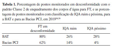 Levando em consideração ambas as bacias, com enfoque no FT, é possível notar que não houve melhora significativa dos parâmetros de classificação em que os pontos monitorados estavam enquadrados. Isso é justificado ao analisar os dados apresentados anteriormente, para a BAT, em que somente um reservatório de dezenas, e dois pontos de monitoramento de 37, encontraram-se dentro das conformidades de FT, para ambientes lênticos e lóticos, respectivamente. Ao se referir as Bacias PCJ, nota-se que o parâmetro de FT apresentou melhora irrisória em relação a outros parâmetros destacados, sendo o pior em ambos os períodos de comparação, com mais da metade fora do que é requerido na análise. Foi possível notar também o impacto dos níveis de coluna d'água, onde, em sua diminuição, pela ressuspensão de sedimentos, existe o prejudicial incremento da concentração de fósforo.42 A fim de atingir o enquadramento dos corpos d'agua, é necessário a aplicação de diferentes tipos de tratamentos, segundo os limites de lançamento de P, de modo que quanto menor a concentração final, maiores são as estruturas de tratamento e a sua complexidade.43